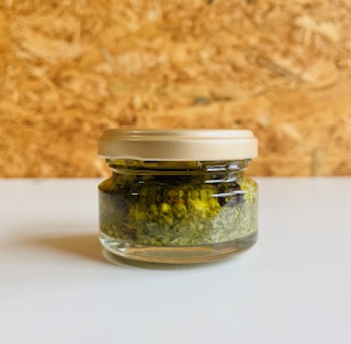日本固有の薬草で、セリ科の多年草であるトウキ。根は生薬の「当帰」として用いますが、葉は食品として使用できます。トウキ葉はセロリのような風味の和ハーブであり、その特徴を活かしたオイルソースを開発しました。パンやチーズ、ジャガイモなどと相性が良く、またパスタソースとしても利用できます。