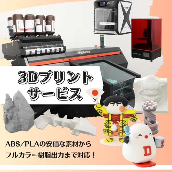 フルカラー樹脂のほか、ABS/PLA等の単色素材による3Dプリントで、フィギュアやノベルティグッズなどの製作に対応いたします。