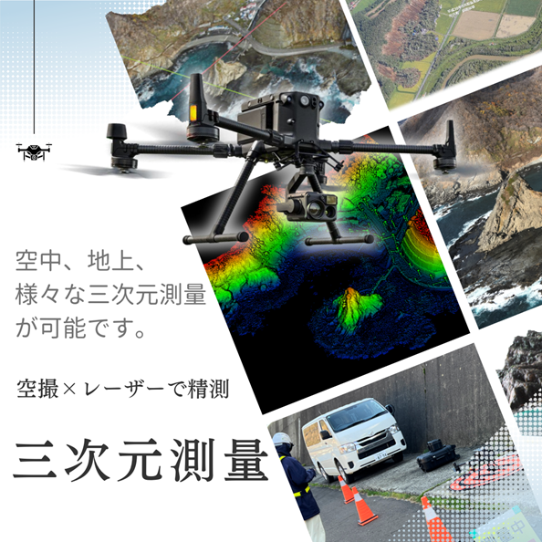 ドローン搭載型レーザスキャナ等による測量の実施・計測データ編集から成果物作成までワンストップで対応。