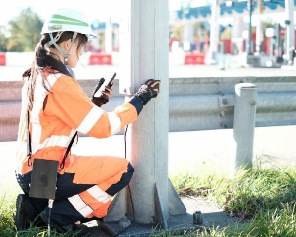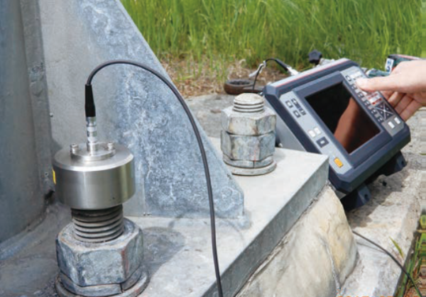 超音波技術を利用して、ナットを外すことなく、目に見えない部分のアンカーボルトの劣化状況を判別可能