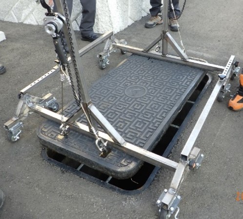■レバーホイストでハンドホール蓋を持ち上げ作業員の負担を軽減