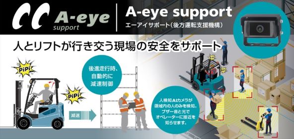 人とリフトが行き交う現場の安全をAIでサポート。自動減速制御、ブザーと音でオペレーターに接近を知らせます。