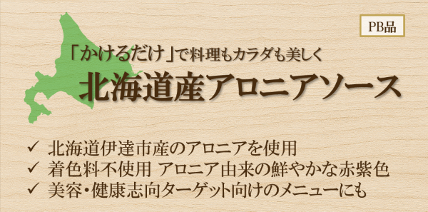 このコンセプトのもと、現在当社では北海道伊達市産のアロニアを使用したソースを開発しております。主に外食店や中食業態の企業様向けに、健康と美味しさを両立した商品づくりを目指しています。