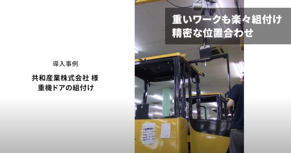 自動車等の製造工程での部品の組付け・搭載作業/金型等の重量物の搬送作業/加工機や測定器への部品のセット作業/ガラス等繊細なワークの搬送作業/長尺物・大型ワークの搬送・点検作業にも。