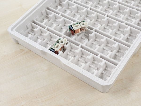 発泡スチロール製トレイは寸法精度が高く、複雑な形状も可能です。反りや変形がすくないのも特徴です。軽量で作業性も向上。帯電防止処理により埃の吸着防止性能もあります。是非会場でご覧ください。