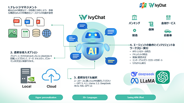 IvyChatはAI活用をしたアシスタントで、企業のワークフローに革命をもたらし、顧客サポートを向上させ、インテリジェントなビジネスインサイトを提供します。クラウドおよびオンプレミスシステムとシームレスに統合させることで、AIによる自動化によって企業を支援し、最大限に効率化と成長を実現します。