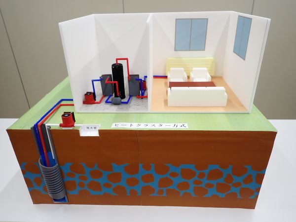 3Dプリンタ等で作成した模型により、井戸内で地下水と採熱管内の不凍液を熱交換する採熱システムの仕組みを示します。